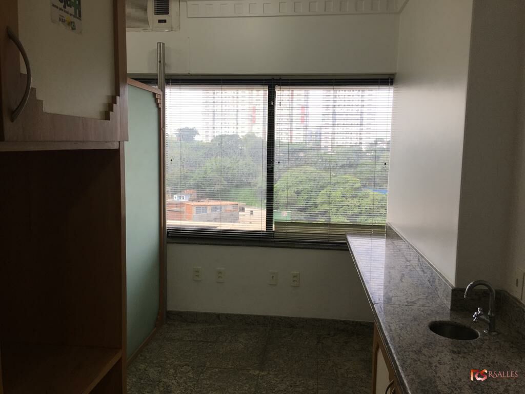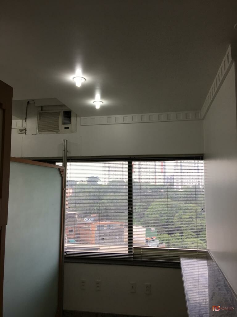 Sala comercial pronta com divisórias , bancada com pia em granito, armários , andar alto, recepção, cortina, nascente, banheiro privativo, piso em granito, cerâmica no banheiro, ar condicionado e ventilador na recepção, 1 vaga de garagem.